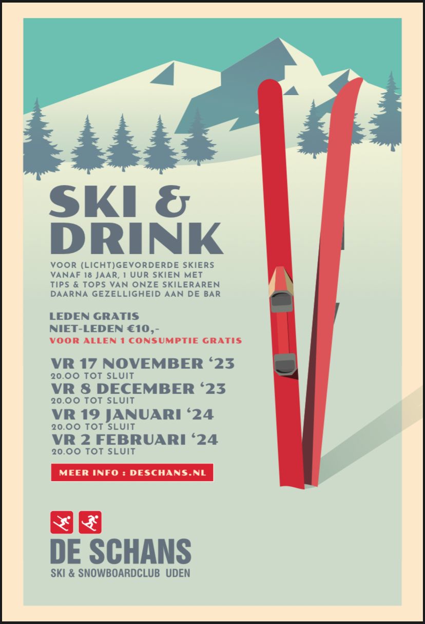 Wij nodigen alle (licht) gevorderde skiërs vanaf 18 jaar uit voor Ski & Drink. Vier avonden, 1uur skiën met tips & tops van onze skileraren en daarna ouderwetse gezelligheid aan onze bar met een drankje en een hapje.